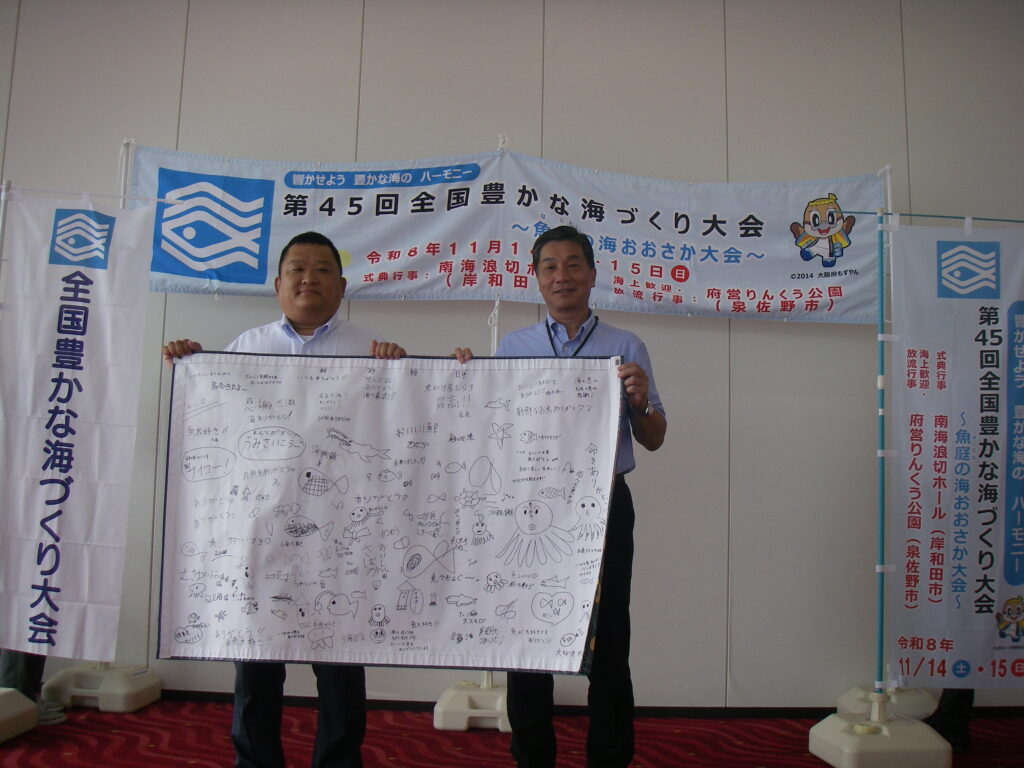 令和7年9月22日(月曜日)に、公益社団法人岸和田青年会議所から大漁旗を贈呈いただきました。岸和田市立産業高等学校の生徒達にデザインいただいたもので、表面には大きなクロダイが描かれています。裏面には、子ども達などからの海への感謝が込められたメッセージを沢山いただいています!今後、PRイベント等で大漁旗を活用させていただく予定です。