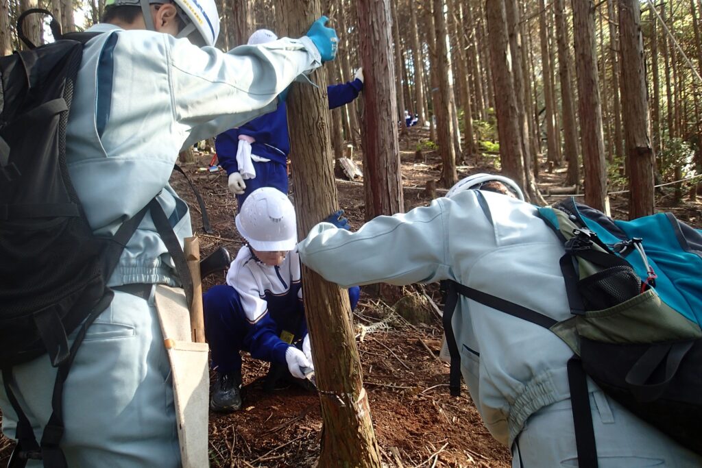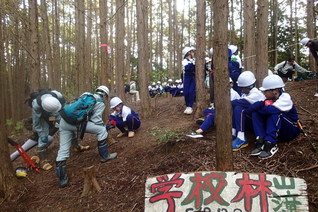 岸和田市立山滝中学校は、里山活動が自然や私たちの生活に与える影響を知ること、また間伐し、木材を有効利用することでカーボンニュートラルを体験し、理解することなどを目的に、学校林体験学習を実施しています。