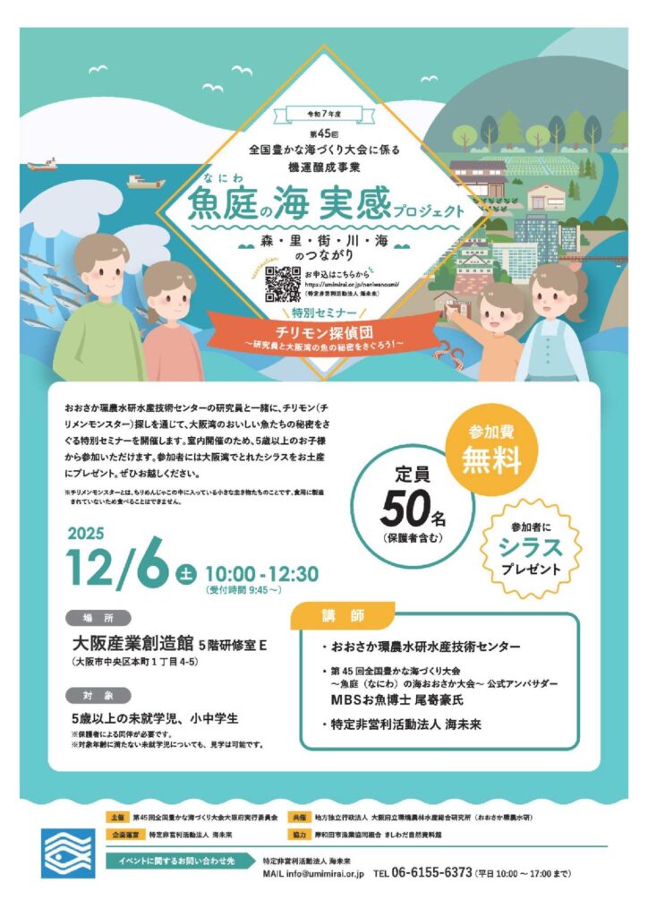 さらに、チリモン(チリメンモンスター)探しを通じて、大阪湾のおいしい魚たちの秘密をさぐるセミナ―を開催します。