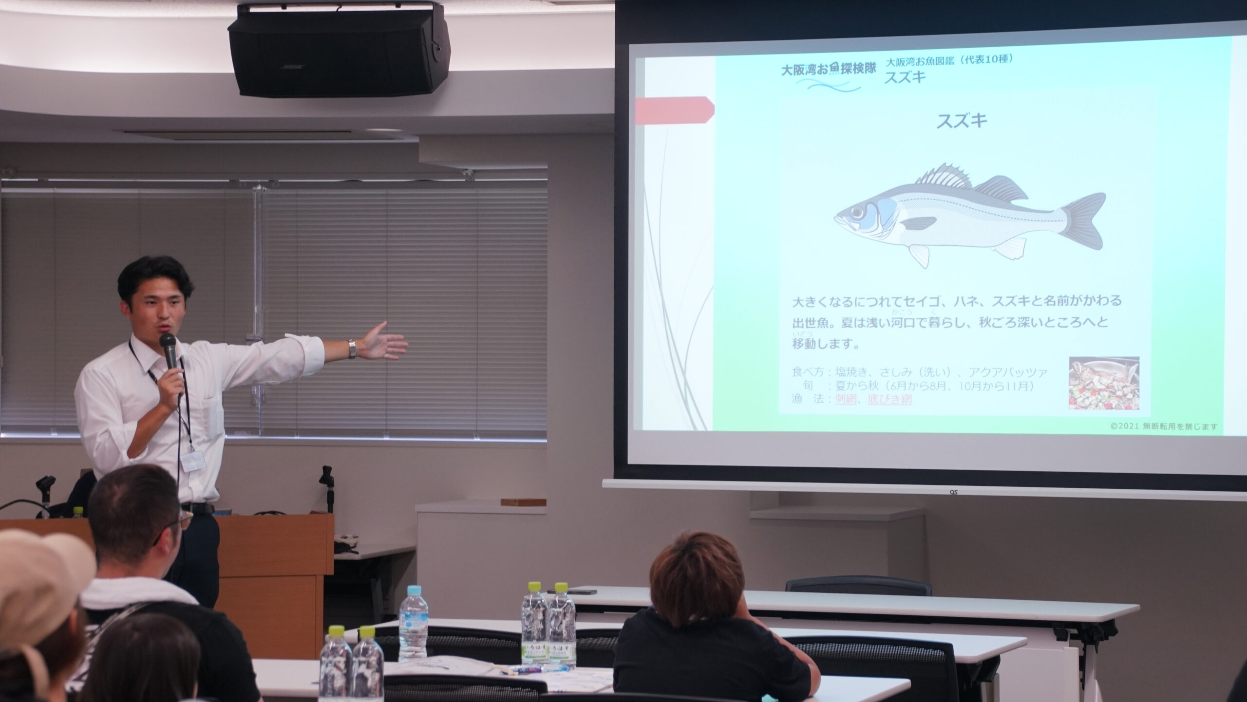 関西エアポート株式会社、大阪府漁業協同組合連合会の大阪湾の環境保全の取り組み紹介やチャーター船による空港周辺の藻場環境の見学と海域で採れる魚や漁の説明を通じて大阪湾の豊かさについて学んでいただける機会となりました。